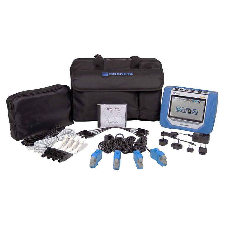 All Dranetz HDPQ Visa PQ Analyzers come with a 7 WVGA LCD Touch Screen, Ethernet, USB and 4GB of memory. All packages include the instrument, Dranview 7 Pro PC software, AC power adapter with universal country plugs, soft case and a voltage cable & accessory set that includes: